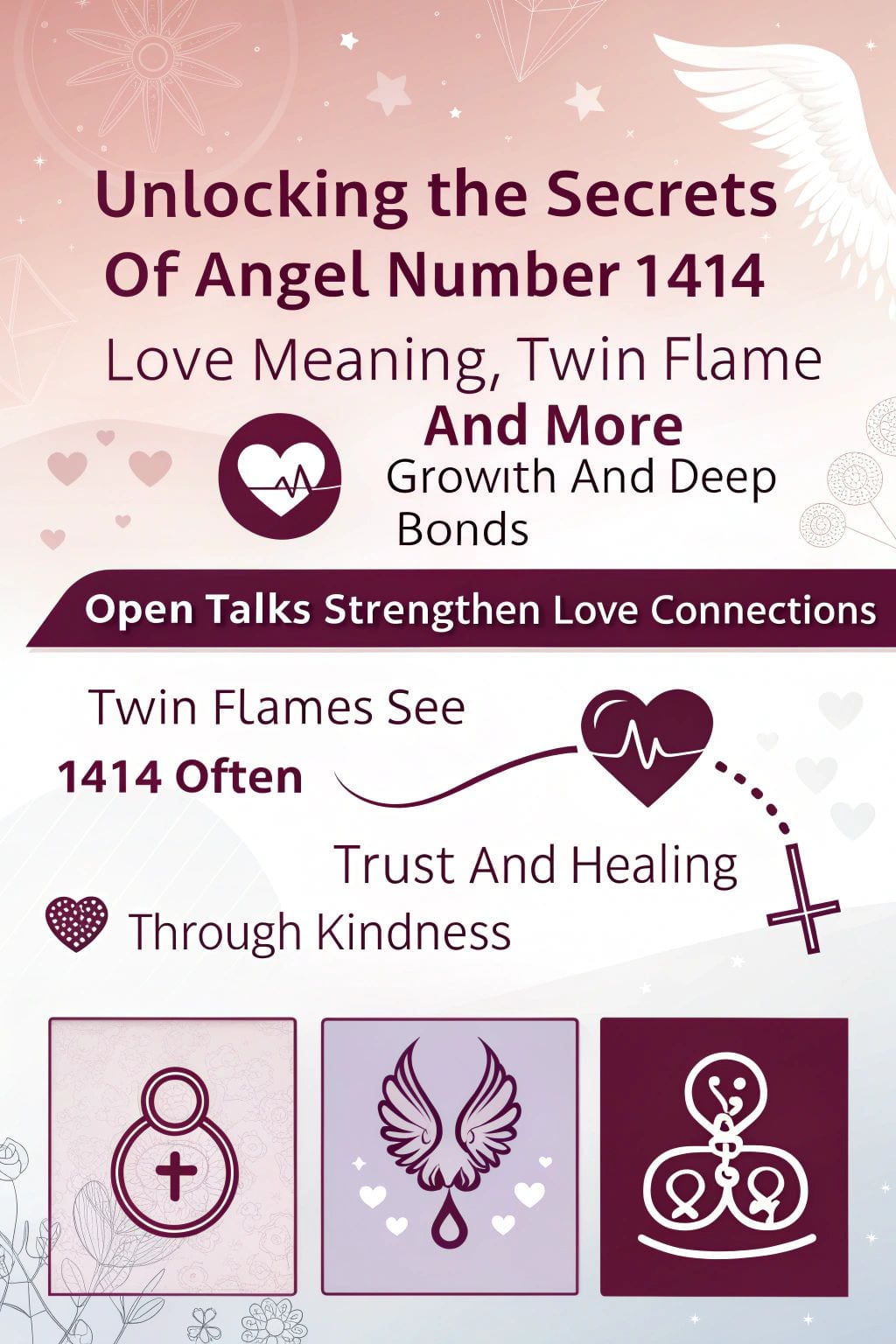 - Angel number 1414 shows up during key times in love and points to deep bonds. It mixes numbers 1 and 4 twice to create balance in love ties.